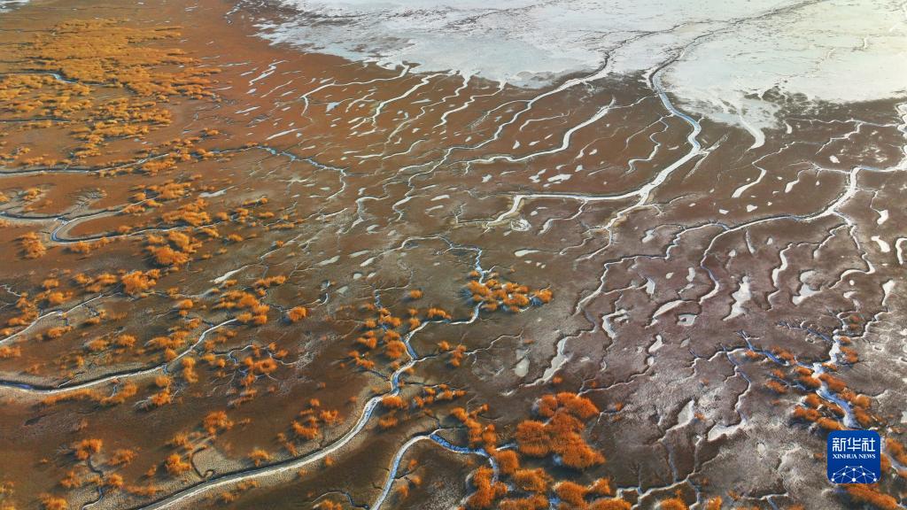近日,在遼寧盤(pán)錦遼河口濕地,海水在潮汐作用下涌入遼河口濕地的潮溝,并凝結成冰,從高空看去,宛若蜿蜒曲折、形態(tài)各異的“冰脈”。