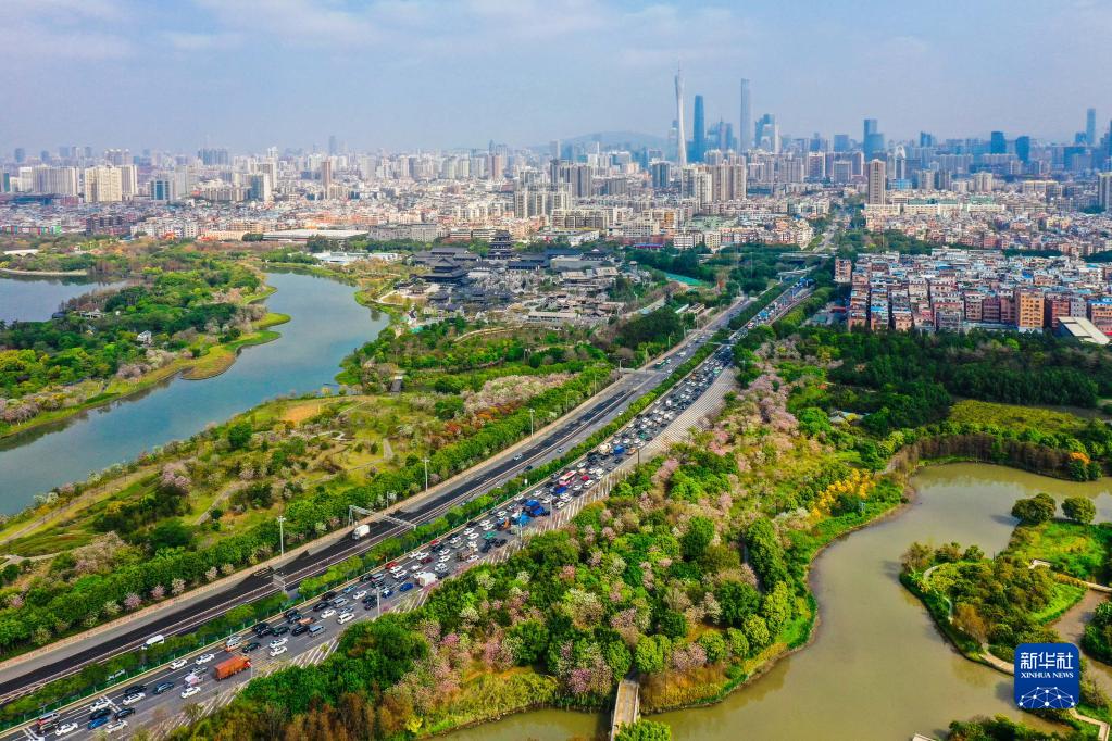 廣州海珠濕地宮粉紫荊綻放(2022年3月11日攝,無(wú)人機照片)。