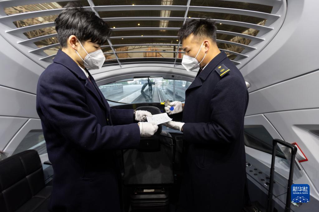 2月1日早晨6時(shí)50分許,上海機輛段司機陳逸東(左)完成DJ7715次動(dòng)檢車(chē)既定線(xiàn)路任務(wù)后返回上海站,與司機王雪巖(右)在司機室內進(jìn)行交接。這輛車(chē)將變更為G8262次列車(chē),承擔上海到睢寧的載客任務(wù)。