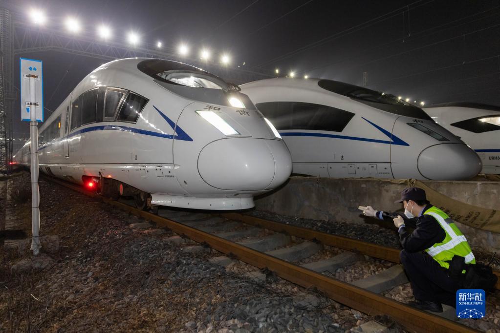 2月1日凌晨3時(shí)許,上海動(dòng)車(chē)段隨車(chē)機械師吳家樂(lè )檢查??磕舷鑴?dòng)車(chē)運用所存車(chē)線(xiàn)上的DJ7716次高鐵確認列車(chē)。