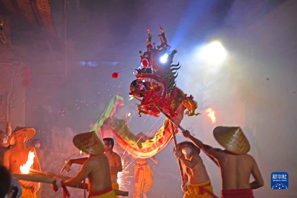 人們在廣西南寧市賓陽(yáng)縣縣城舞炮龍(2月1日攝)。