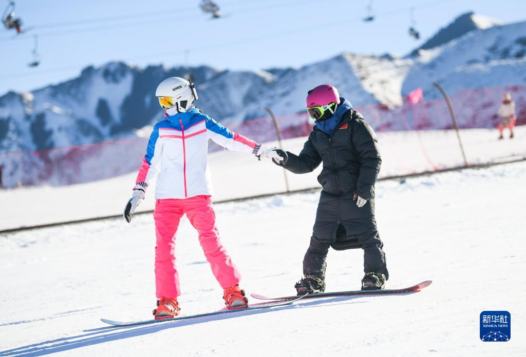 在新疆白云國際滑雪場(chǎng),許秀娟(右)教學(xué)員單板滑雪技巧(1月26日攝)。