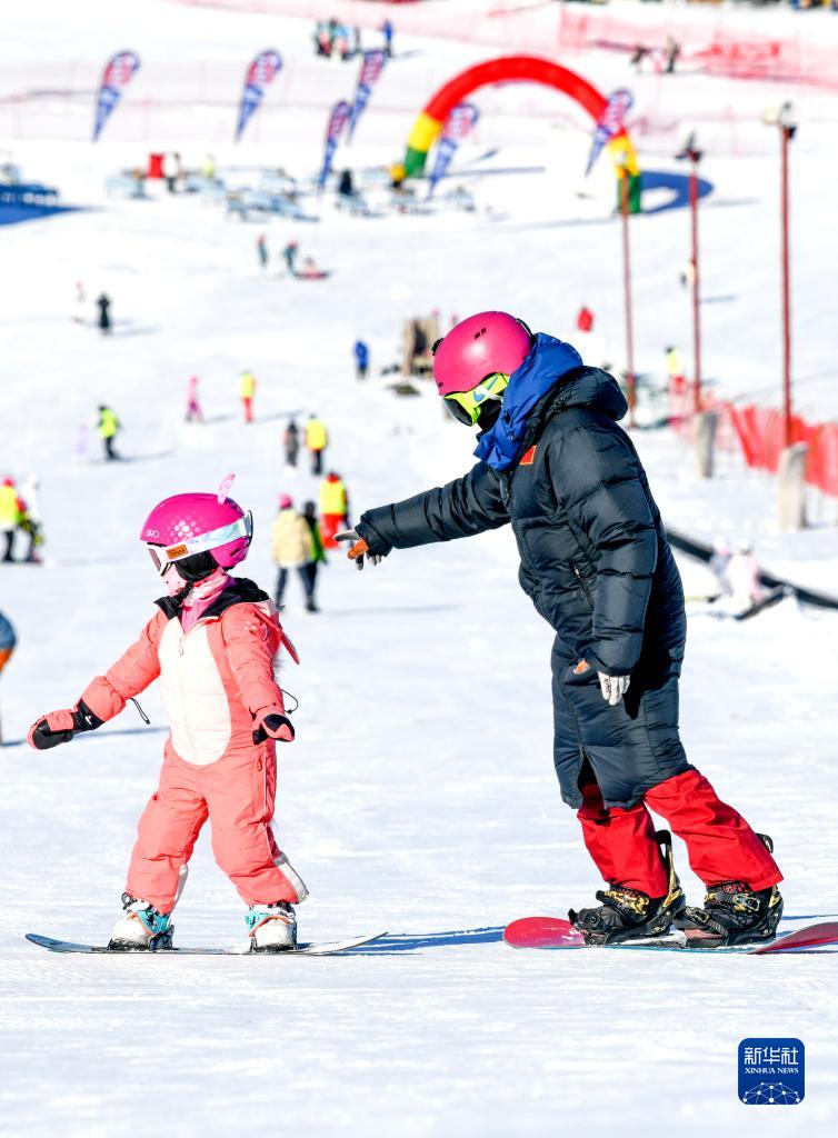 在新疆白云國際滑雪場(chǎng),許秀娟(右)教小學(xué)員單板滑雪技巧(1月13日攝)。