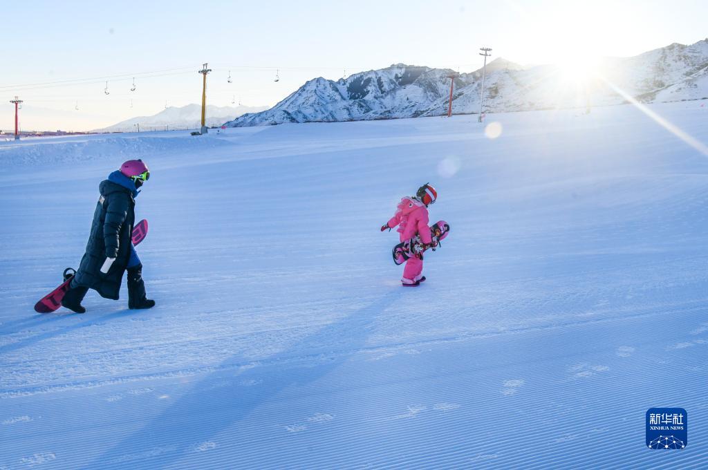 在新疆白云國際滑雪場(chǎng),許秀娟(左)帶著(zhù)小學(xué)員儲宥善前往雪道,準備上課(1月26日攝)。