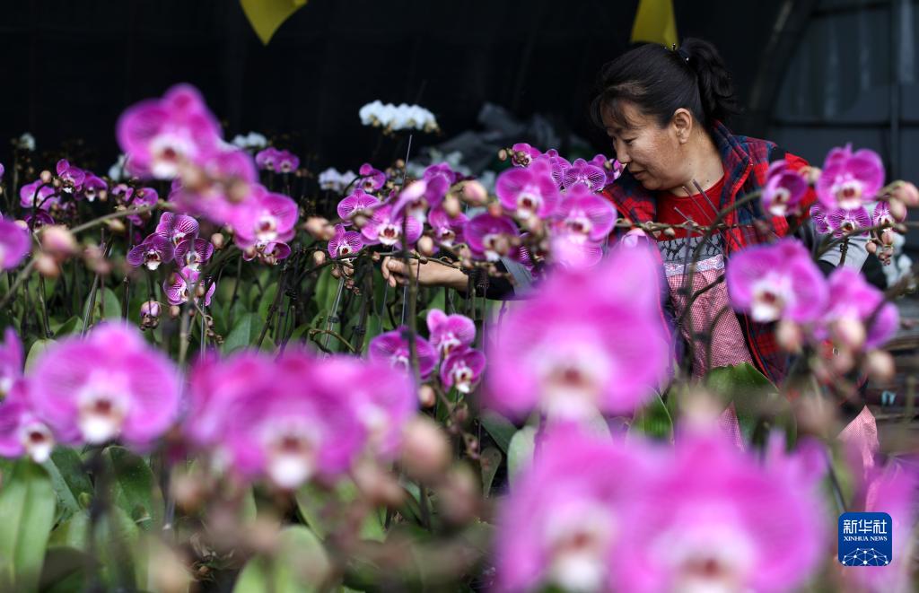 2月1日,沈陽(yáng)市十里河街道花卉基地一位花農在大棚內對蝴蝶蘭進(jìn)行花間管理。