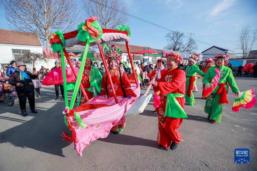 2月2日,河北省遵化市西下?tīng)I滿(mǎn)族鄉的民間藝人在表演劃旱船。