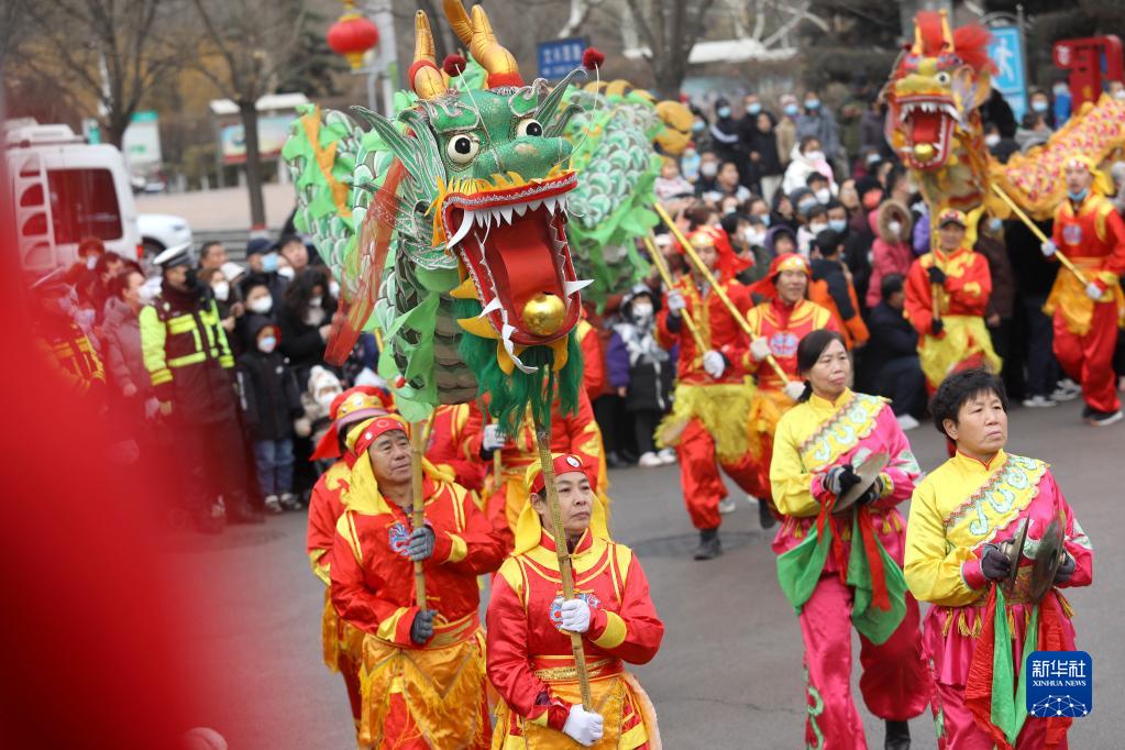 2月2日,龍鼓方陣演員在河北省石家莊市井陘礦區舉辦的民間花會(huì )展演活動(dòng)中進(jìn)行踩街巡演。