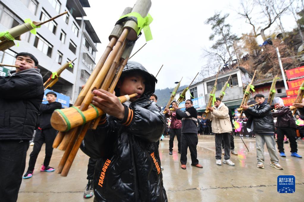 2月2日,融水苗族自治縣桿洞鄉黨鳩村苗族少年在吹蘆笙。