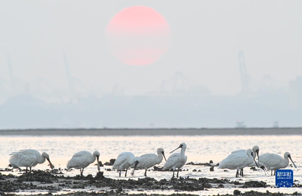 世界珍稀鳥(niǎo)類(lèi)黑臉琵鷺在海南儋州灣濕地棲息(2022年12月13日攝)。