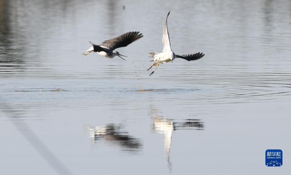 兩只青腳鷸在海南東寨港國家級自然保護區內飛翔(1月30日攝)。