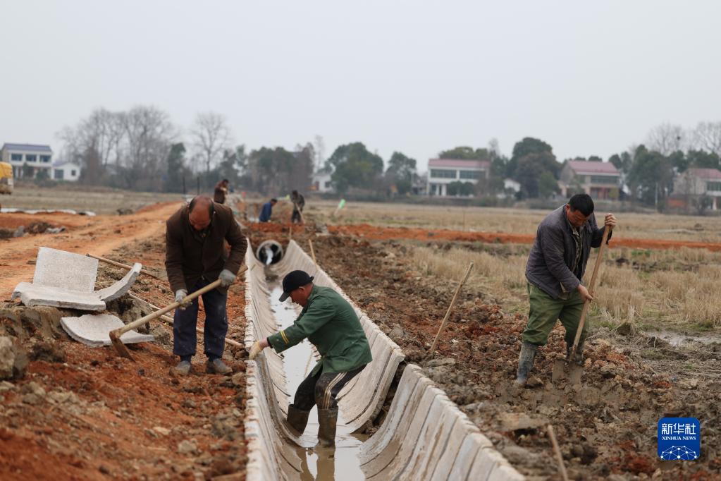 2月2日,工人在湖南省益陽(yáng)市赫山區筆架山鄉新崇安村高標準農田建設現場(chǎng)修建排水渠。