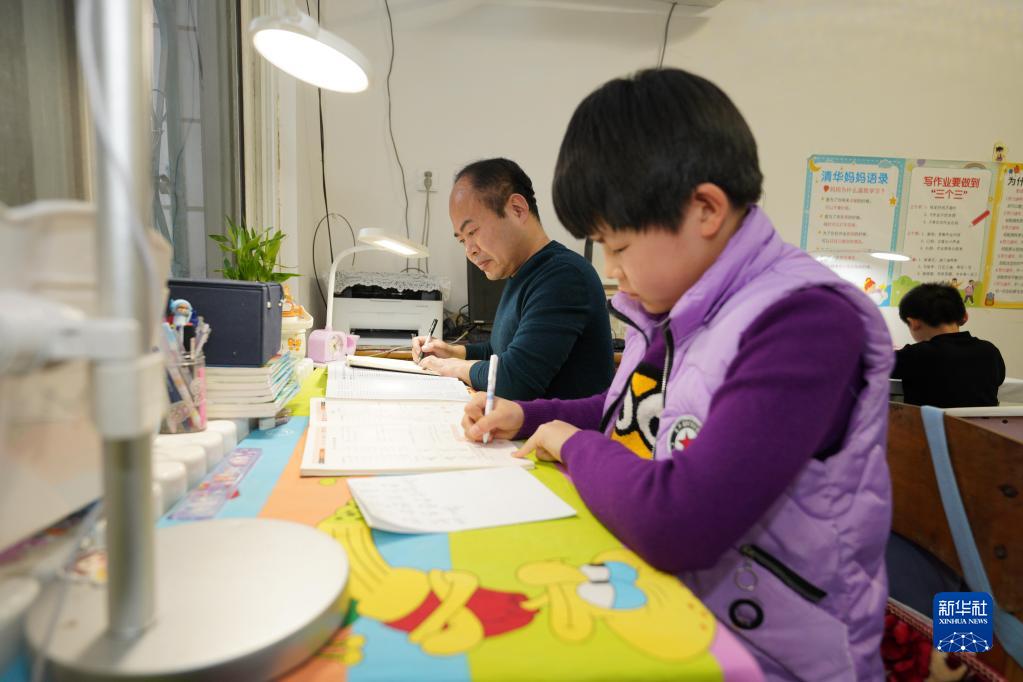 2月2日,王保欣在家里和孩子一起學(xué)習。
