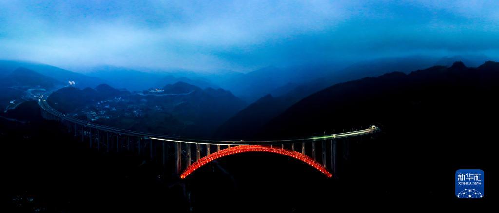 這是2月2日在貴州省遵義市拍攝的夜幕下的大發(fā)渠特大橋(無(wú)人機全景照片)。