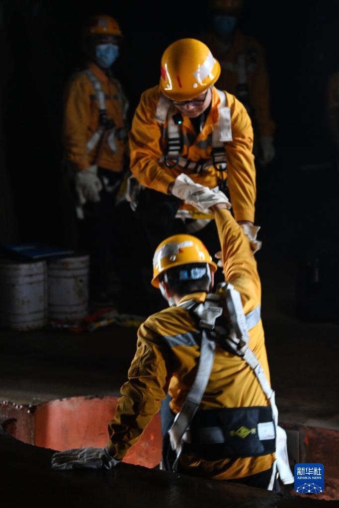 2月2日,橋梁工們在進(jìn)入狹小的墩頂檢查口時(shí)互相攙扶。