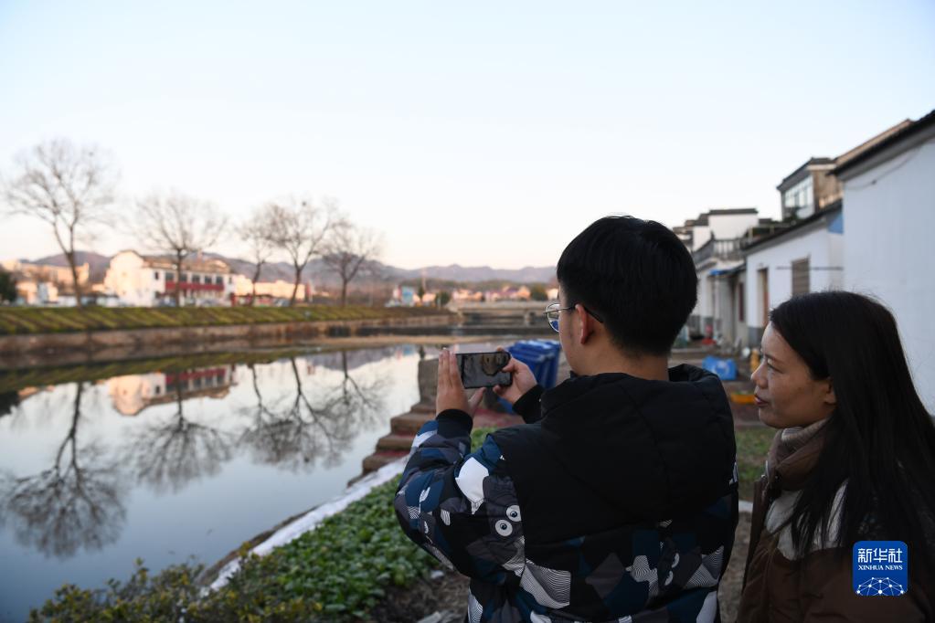 1月31日,郭昊(左)在安徽省六安市舒城縣湯池鎮拍攝家鄉風(fēng)景,媽媽汪學(xué)年在一旁陪伴。