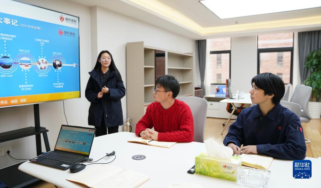 江西國軒新能源科技有限公司實(shí)習員工周詩(shī)航(右)在公司接受相關(guān)培訓(2月2日攝)。