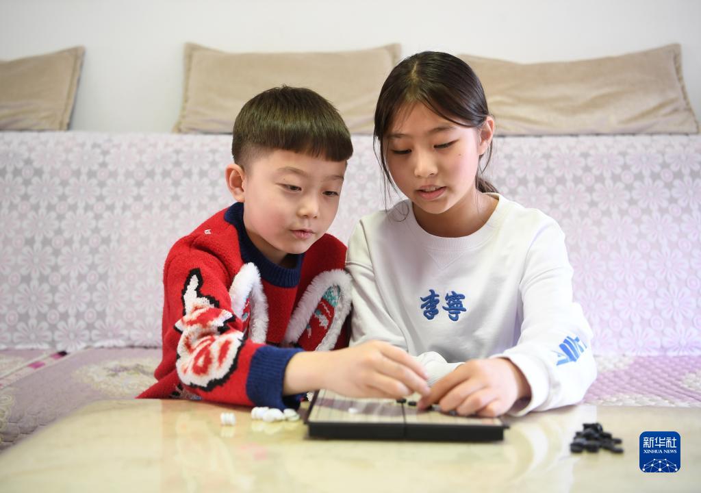 在河北省保定市阜平縣,馬蘭花兒童聲合唱團團員趙懿萱(右)和弟弟在家一起下五子棋(1月29日攝)。