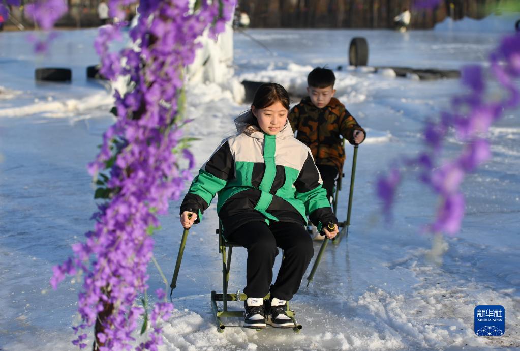 馬蘭花兒童聲合唱團團員趙懿萱(前)在河北省保定市阜平縣的一個(gè)冰雪游樂(lè )場(chǎng)內和弟弟一起玩耍(1月29日攝)。