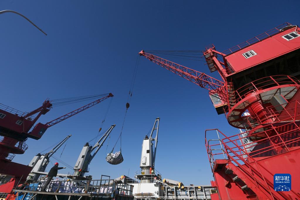 舟山遠洋漁業(yè)基地的碼頭上,遠洋漁船正在卸貨(1月31日攝)。舟山遠洋漁業(yè)基地2022年遠洋自捕魚(yú)進(jìn)關(guān)量達62萬(wàn)噸,2016-2022年累計近278萬(wàn)噸。