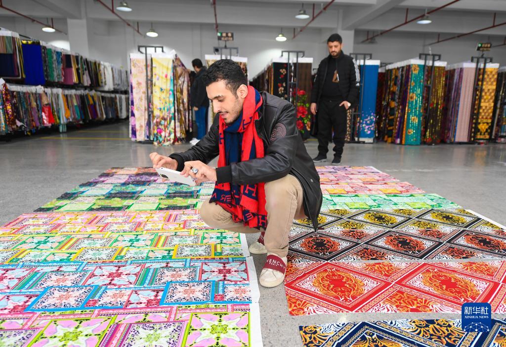 2月3日,在紹興柯橋,也門(mén)人阿珂拉姆通過(guò)手機視頻向中東的客商介紹布樣。