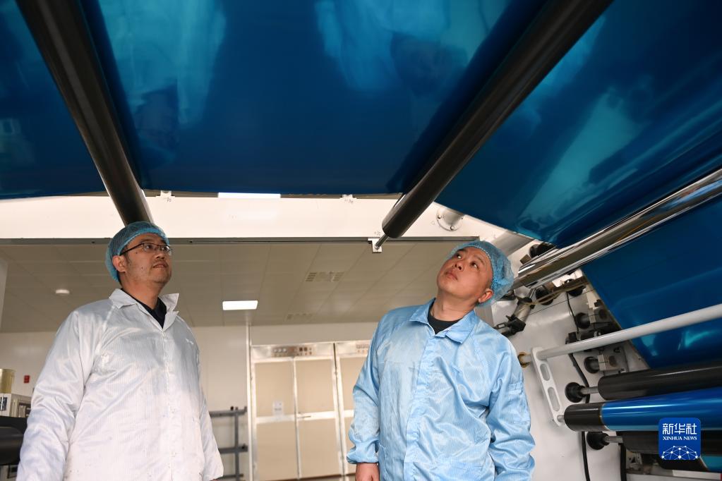工人在寧波瑞凌新能源科技有限公司的降溫薄膜自動(dòng)化生產(chǎn)車(chē)間監測設備運行(2月1日攝)。