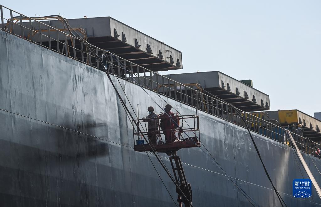 萬(wàn)邦船舶重工(舟山)有限公司的船塢內,工作人員在對一艘外籍貨輪進(jìn)行修理作業(yè)(1月31日攝)。春節期間,位于舟山市普陀區小干島的萬(wàn)邦船舶重工(舟山)有限公司的沿海岸線(xiàn)碼頭上排滿(mǎn)等待修理的船舶,一臺臺高空作業(yè)平臺車(chē)環(huán)繞著(zhù)萬(wàn)噸巨輪加緊運轉作業(yè),一季度訂單已經(jīng)全部排滿(mǎn)。
