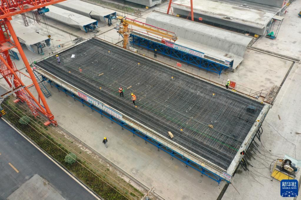 2月4日,在渝昆高鐵重慶段建設施工現場(chǎng),工人在制作箱梁(無(wú)人機照片)。