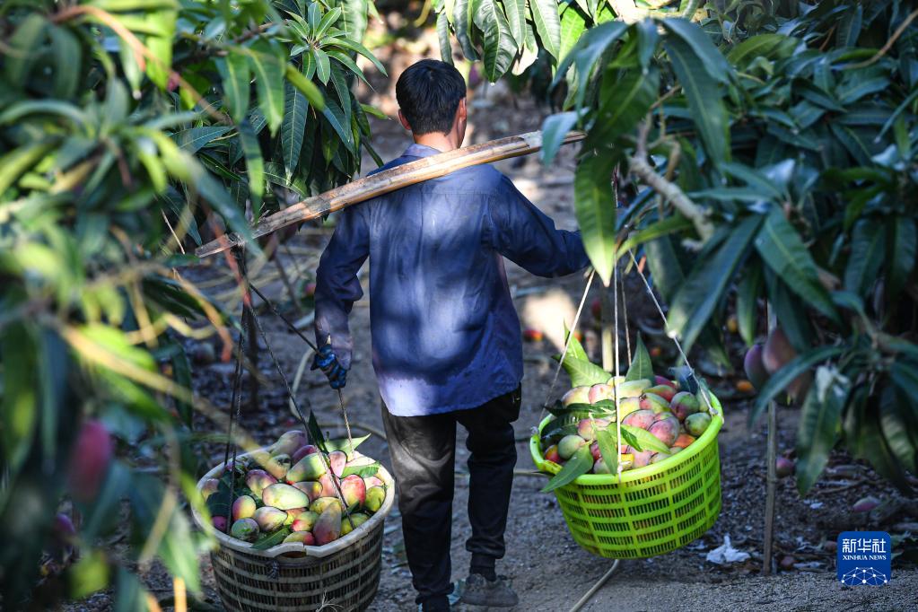在海南省三亞市育才生態(tài)區芒果園,農民在轉運采收的芒果(2月1日攝)。
