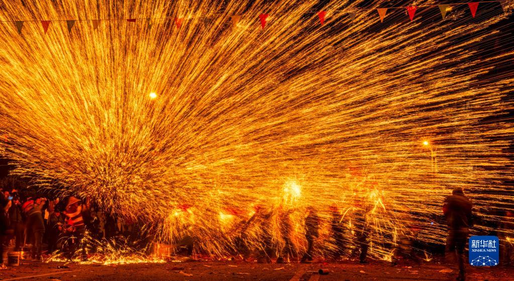 1月30日,民間藝人在貴州省遵義市播州區茍江鎮表演“打鐵花”。