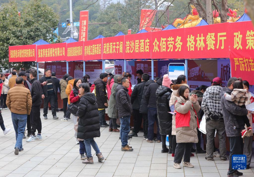 2月4日,在湖南張家界市武陵源區協(xié)合鄉舉行的“春風(fēng)送暖”農村用工招聘會(huì )上,村民在了解崗位信息。當地20多家企業(yè)提供采茶工、廚師、講解員、酒店服務(wù)員等500多個(gè)就業(yè)崗位,幫助更多農村群眾實(shí)現家門(mén)口就業(yè)。