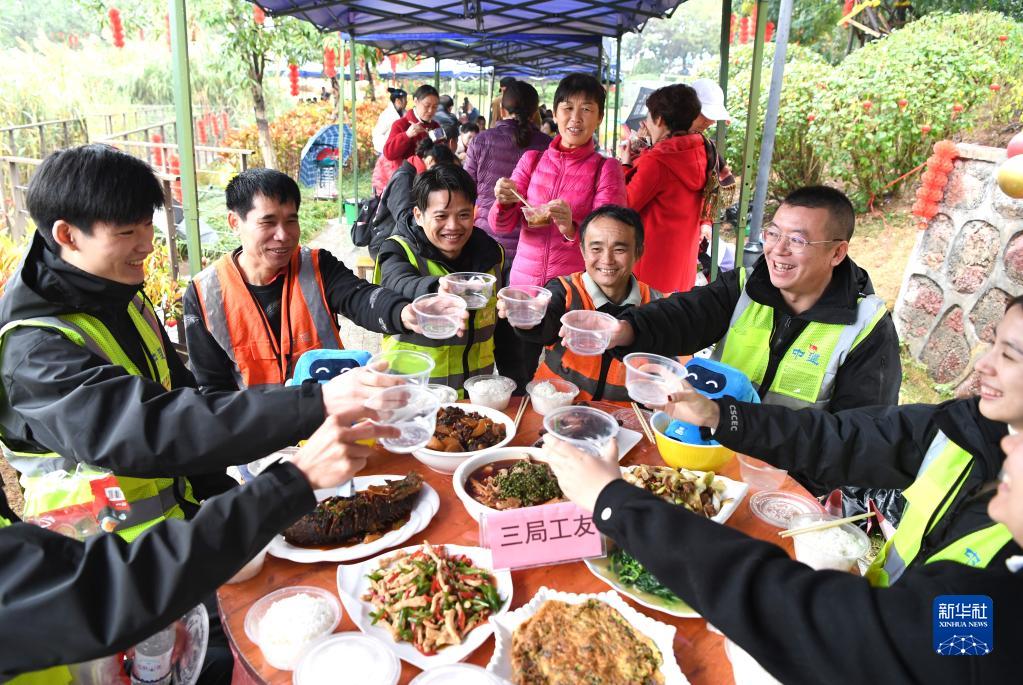 2月4日,廣西南寧市良慶區良慶鎮宋廂社區和中建三局第一建設工程有限責任公司聯(lián)合舉辦“歡樂(lè )元宵百家宴”活動(dòng)。這是居民和建筑工人一同參加百家宴。