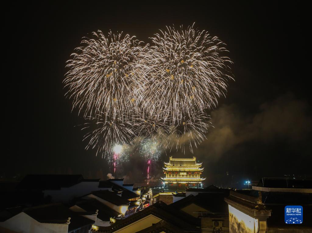 2月4日,浙江省建德市梅城鎮嚴州古城的澄清門(mén)上空焰火綻放(無(wú)人機照片)。