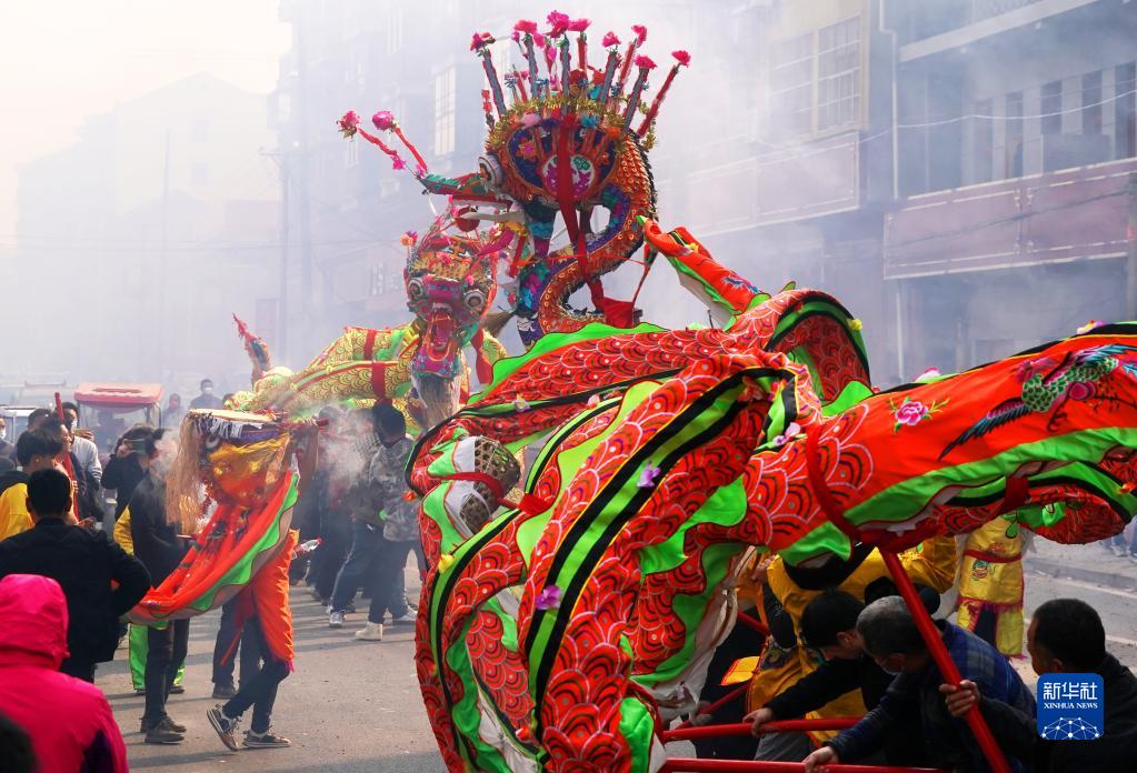 2月4日,湖北孝感楊店鎮的居民舞龍隊走街穿巷鬧元宵。