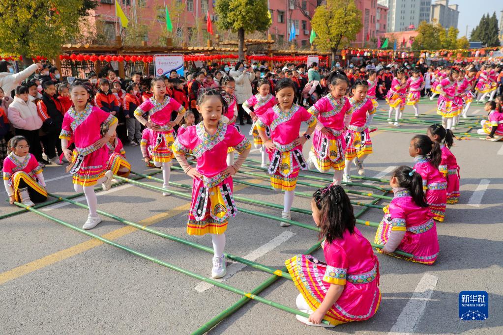 2月4日,安徽省淮北市濉溪路小學(xué)的學(xué)生們在跳竹竿舞。