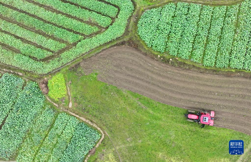 2月4日,在湖南省衡陽(yáng)市衡東縣楊林鎮寺門(mén)前村,農機手駕駛農機在翻耕農田(無(wú)人機照片)。