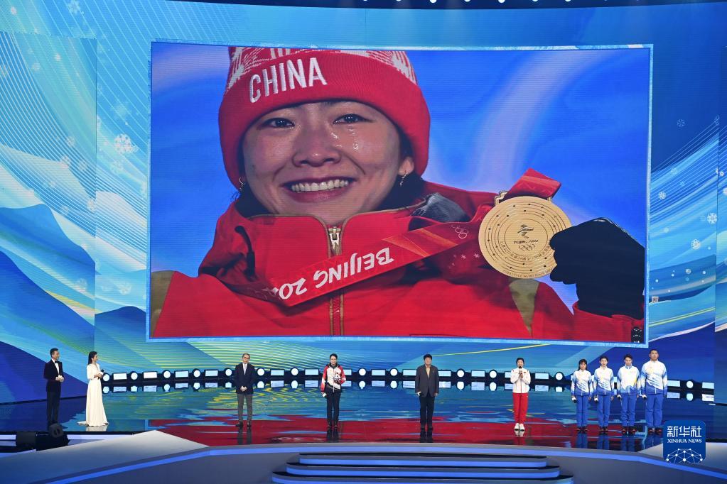 2月4日,運動(dòng)員徐夢(mèng)桃(右五)在啟動(dòng)儀式上的冬奧人訪(fǎng)談環(huán)節發(fā)言。