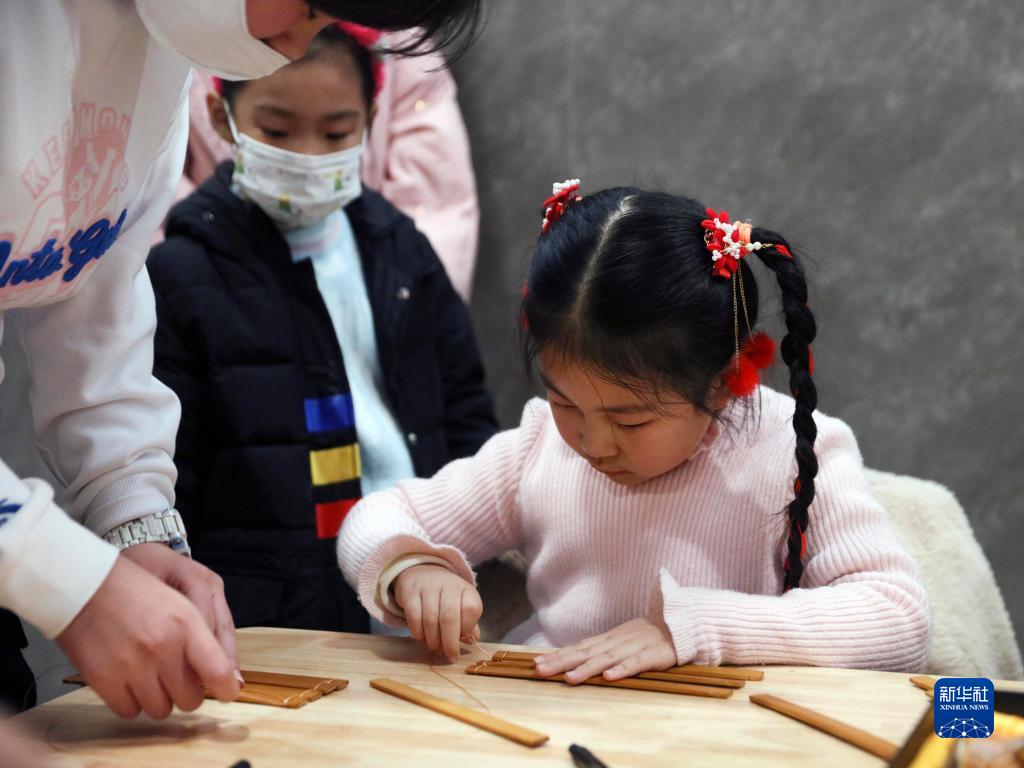 2月4日,小朋友在中國文字博物館體驗竹簡(jiǎn)制作。