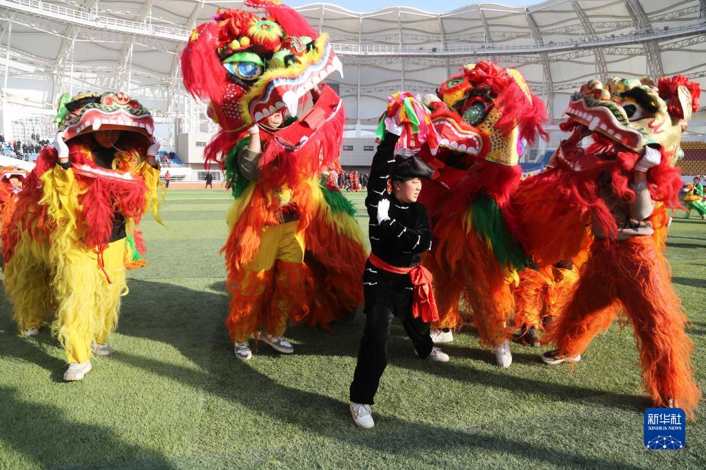 2月4日,社火隊在甘肅省定西市體育公園表演舞獅。