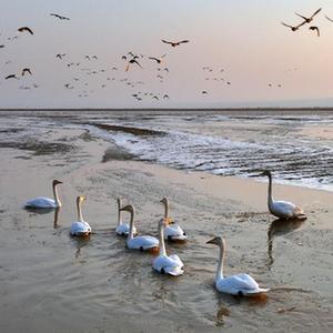 近日,黃河西岸的合陽(yáng)黃河濕地自然保護區內,天鵝今年首次規模出現,數量近千只。