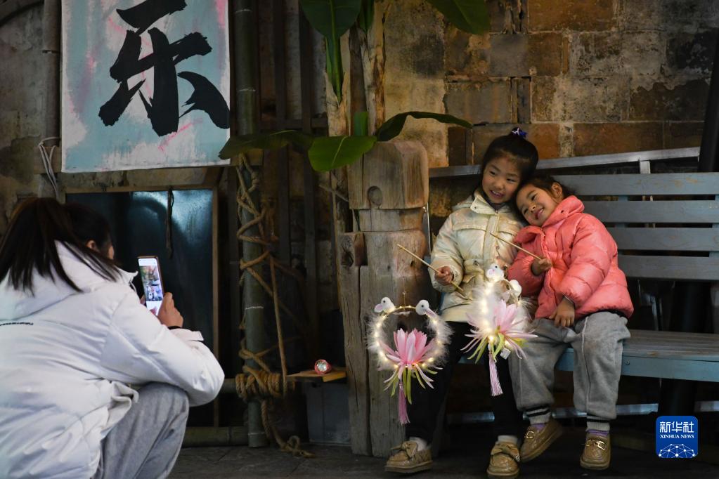 2月4日,家長(cháng)在宏村給小朋友拍照。