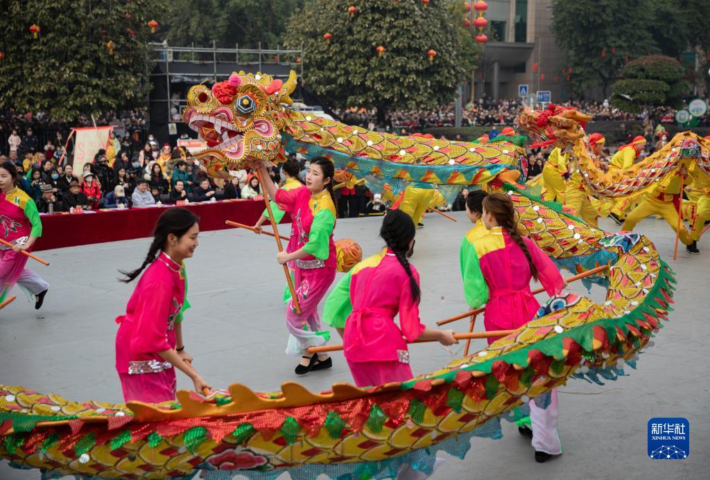 2月5日,在四川省瀘縣人民廣場(chǎng),瀘縣海潮鎮龍舞代表隊表演《海潮鴛鴦龍》。