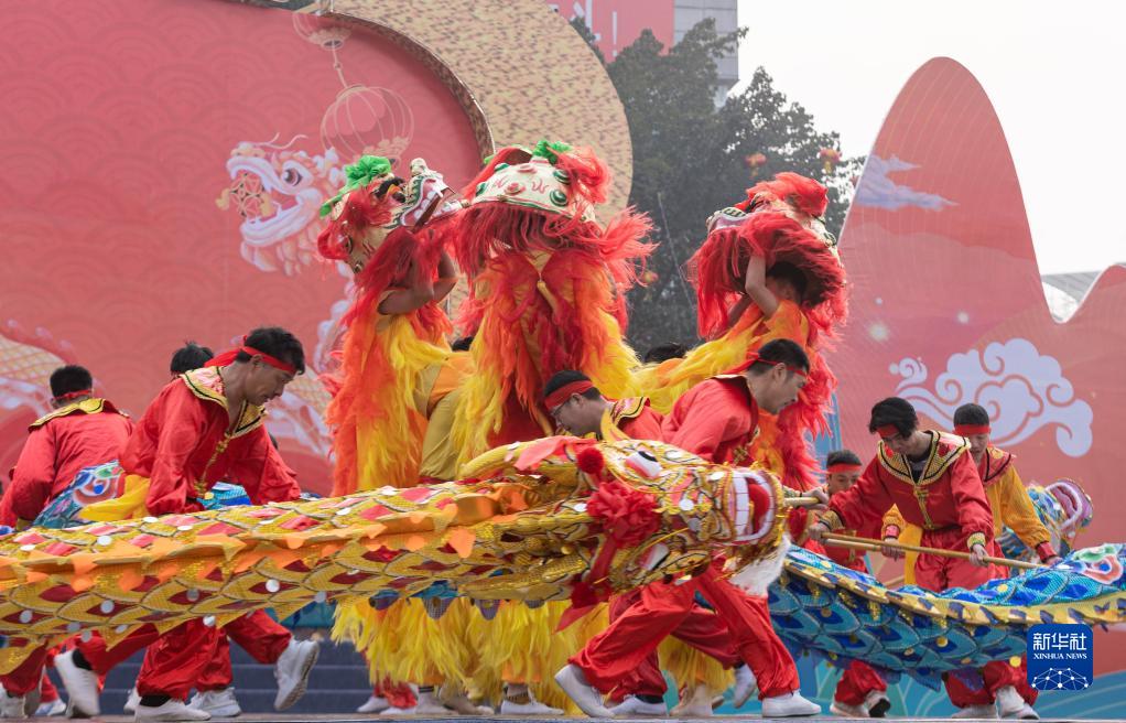 2月5日,在四川省瀘縣人民廣場(chǎng),瀘縣玄灘鎮龍舞代表隊表演《龍騰獅躍》。