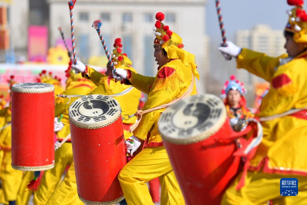 2月5日,在甘肅省白銀市舉辦的社火展演上,民間社火隊的演員進(jìn)行太平鼓表演。