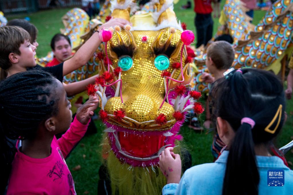 2月4日,在南非約翰內斯堡舉行的元宵節及中國農歷新年慶?;顒?dòng)中,孩子們觀(guān)察舞龍表演的“龍頭”道具。