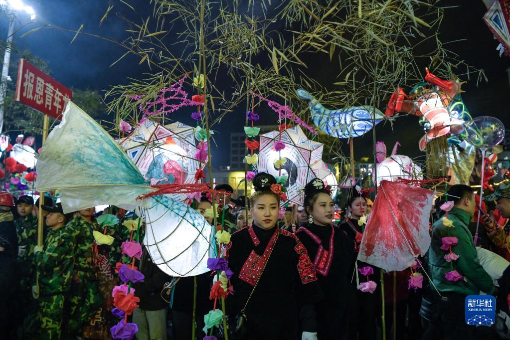 2月4日晚,在臺江縣,人們在參加苗族“舞龍噓花”活動(dòng)時(shí)拿著(zhù)花燈等待入場(chǎng)。