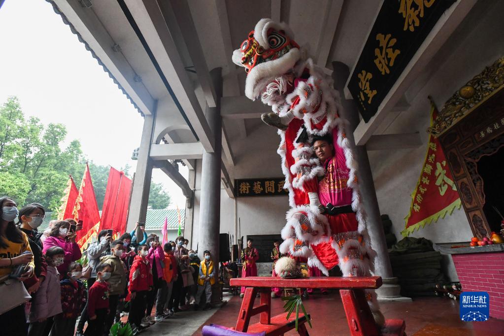 1月12日,在佛山市南海區西樵黃氏宗祠,這里現在也是黃飛鴻獅藝武術(shù)館,獅團為游客表演醒獅。