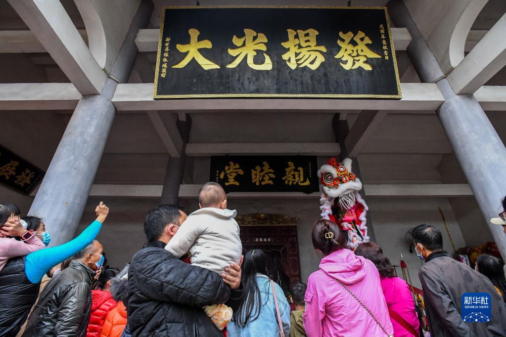 1月12日,在佛山市南海區西樵黃氏宗祠,這里現在也是黃飛鴻獅藝武術(shù)館,獅團為游客表演醒獅。
