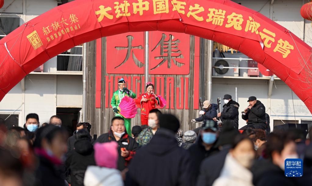 2月5日,演員在有著(zhù)300余年歷史的遼寧省營(yíng)口紅旗大集上表演東北二人轉。