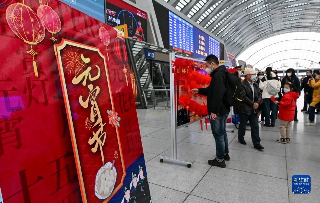 2月5日,在天津西站候車(chē)廳,旅客在猜燈謎。