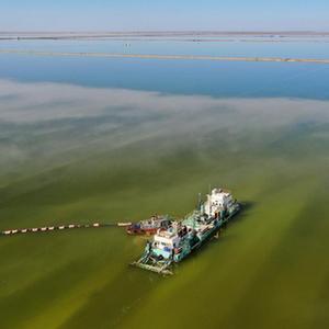 水采船在察爾汗鹽湖中作業(yè)(2月2日攝,無(wú)人機照片)。